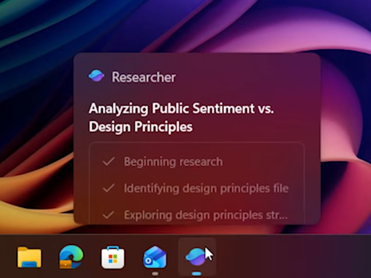「Ask Copilot」ボックスから「Researcher」エージェントを呼び出すと、あたかも一般のアプリのようにタスクバーにボタンが追加される。このタスクボタンには現在のステータスを表すバッジが表示されるほか、マウスオーバーでタスクの内容と進捗状況を示すホバーカードが表示されるようだ。エージェントがちゃんと仕事を遂行しているかどうかが、一目でわかる。レポートが完成すると、デスクトップにトースト通知が表示され、レポートにアクセスできる。