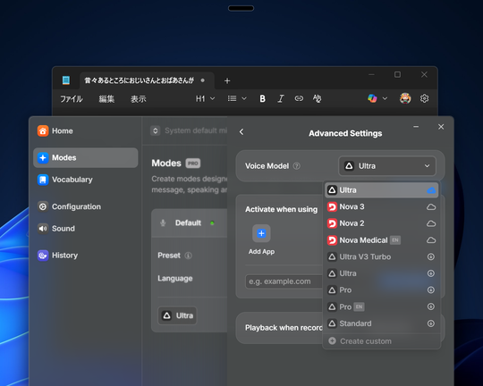 そのほかにも、本ソフトは特別なフレーズ、名前、略語などをあらかじめ登録して聞き間違いを防止するカスタム語彙機能を搭載。有料の「Pro」版(後述)向けの機能とはなるが、「カジュアルなチャット向け」「フォーマルなメール向け」といったシチュエーションごとに「モード」を作成して切り替える機能も備える。ラフに音声入力しても、AI側で設定された「モード」に従って自動的に言い換えてくれるわけだ。