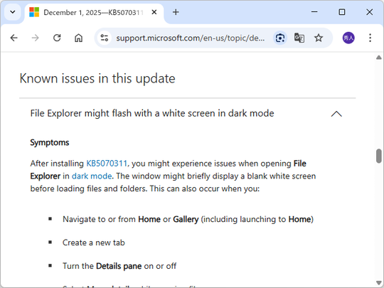 米国時間12月1日にリリースされた「Windows 11 バージョン 24H2/25H2」向けプレビューパッチ「KB5070311」には、「エクスプローラー」のダークモードで発生する問題があるとのこと。米Microsoftが自社のサポートサイトで、既知の問題としてアナウンスしている。