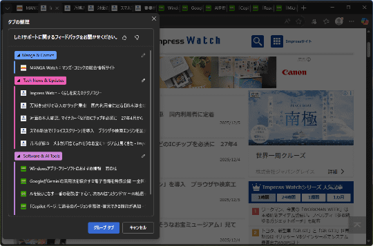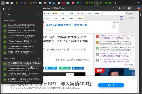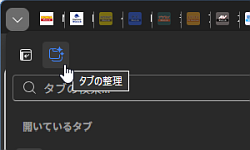 また、タブの検索機能も追加された。タブ検索機能はタブバーの左端にある[∨]ボタンから呼び出せるメニューから行える。現在開いているタブに加え、最近閉じたタブも検索できるため『さっき閉じてしまったあのタブ』を復元したい場合もすばやく対処できる。加えて、[∨]ボタンのメニューからは、垂直タブバーの有効化や、AIを用いたタブのグループ化の実行も行えるため、タブを大量に開いている際にはこのボタンを押すことで、様々な対応が可能だ。