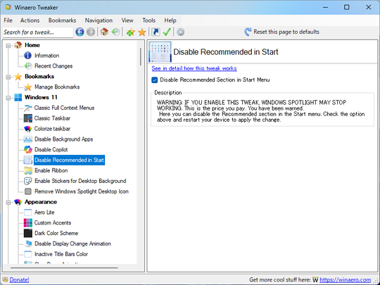 システムカスタマイズツール「Winaero Tweaker」v1.64、スタート画面からおすすめを削除