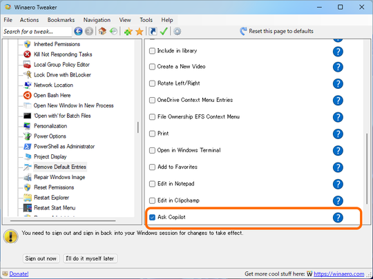 次に、ファイルの右クリックメニューにある既定の項目を削除するオプションが拡充され、[Ask Copilot]メニューを取り除けるようになった。Windows 11の「Copilot」アプリを利用しない人には不要な項目なので、削除しておけばファイルの右クリックメニューがコンパクトになる。