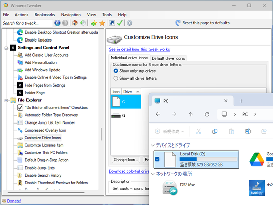 最後に、「エクスプローラー」のカスタマイズ機能にドライブアイコンを変更する機能が追加された。個別のドライブに好みのアイコンを割り当てたり、デフォルトのドライブアイコンを変更したりできる。