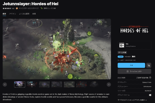 米Epic Gamesが運営するオンラインゲーム配信ストア「Epic Games Store」にて、サバイバルアクションゲーム「Jotunnslayer: Hordes of Hel(巨人殺し: 冥界の怒涛)」の無料配布が開始された。期間は12月20日1時までで、配布開始から24時間限定。受け取った後は永続的に利用できる。