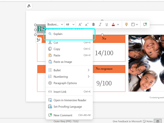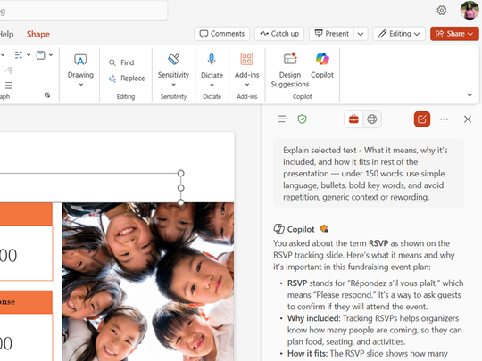 使い方は簡単で、スライドやそれに含まれるオブジェクト(テキストボックスや表、画像など)を選択し、右クリックメニューから[Explain](説明)コマンドを選択するだけだ。「Copilot」サイドパネルが開き、そこに解説が表示される。それでも理解できなければ、プロンプトで追加の解説を依頼することも可能だ。