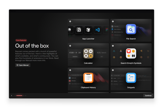 「Raycast」は、高速・軽量なコマンドランチャー。[Alt]+[Space]キーで素早く起動し、アプリの起動やファイル検索、システム設定、クリップボード履歴へのアクセス、スニペット管理、ウィンドウレイアウトといった日頃よく利用する操作をキーボードだけで簡単に行える。