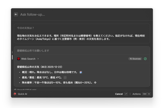 また、ベータテストの間は「Quick AI」が無償で提供される。これは「Raycast」を開いて[Tab]キーを押すとアクセスできるAIチャット機能で、OpenAIの「GPT-5 mini」を利用した調べ物や質問が可能だ。