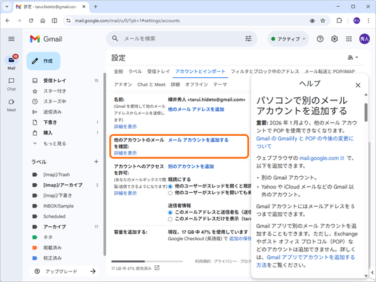 この機能を利用しているかどうかは、「Gmail」の[アカウント]設定ページで確認可能。[他のアカウントのメールを確認]というセクションにメールアカウントが記載されていれば、今回の機能廃止の影響を受ける。