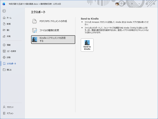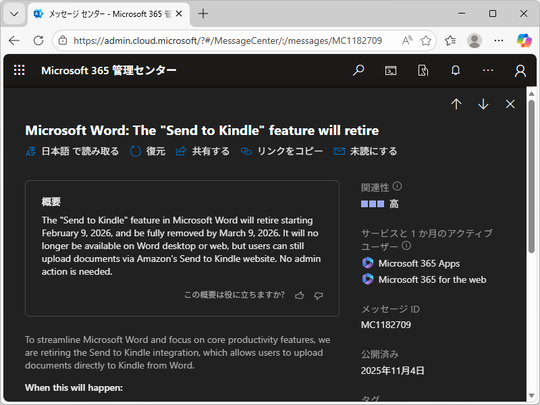 この機能は「Word」で編集したドキュメントを、電子書籍リーダー端末のKindleへ直接送信できるようにするもので、2023年から導入され、デスクトップ版(Windows/Mac)とWeb版で提供されていた(iOS/Android版では当初から提供なし)。