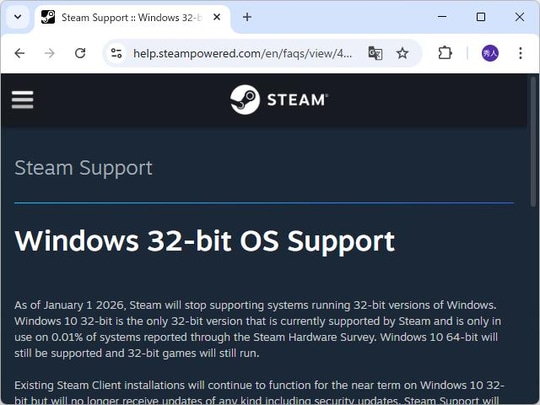 「Steam」の32bit版Windows対応はまもなく終了、2026年1月1日まで
