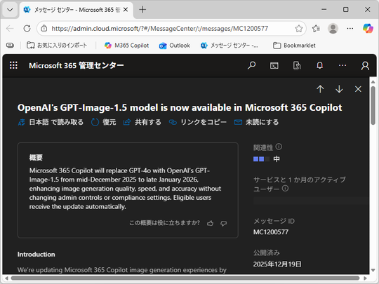 「Microsoft 365 Copilot」の画像生成AIモデルが、「GPT-4o」から「GPT-Image-1.5」に置き換えられるとのこと。米Microsoftが12月19日(現地時間)、「Microsoft 365」の管理センターでアナウンスした。