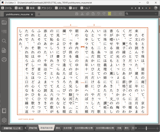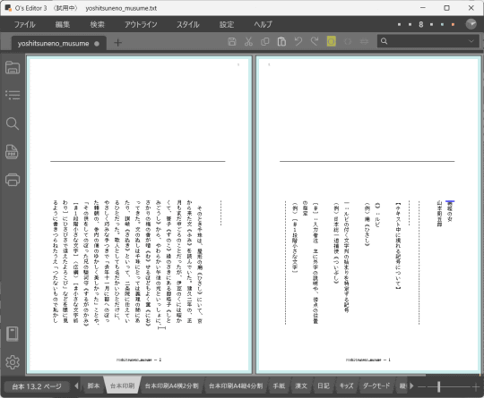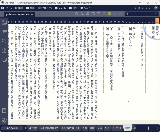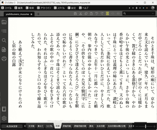 「O's Editor」は、20世紀から縦書き機能を搭載していたテキストエディター。テキストエディターでありながら、書式設定が豊富でワープロソフトのように印刷結果に近い表示で編集できるのが特徴。映画監督でもあるおぬまゆういち氏が開発しており、脚本などの執筆・印刷用途で多く使われていた。