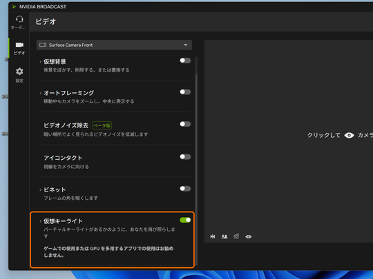 「NVIDIA Broadcast 2.1」では、v2.0でベータ版として導入された「仮想キーライト」機能が正式版となった。
