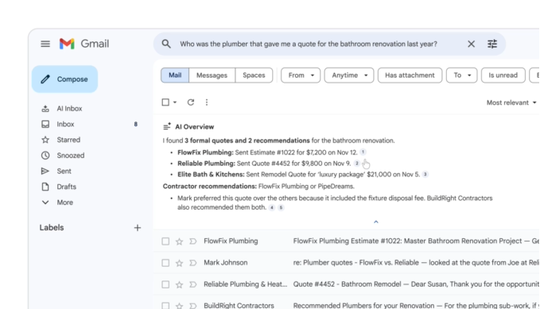 さらに「Google AI Pro」「Google AI Ultra」サブスクリプションに加入していれば、受信トレイで質問をすることも可能。たとえば「去年、バスルームのリフォームを見積もりしてくれた業者は誰でしたか?」などと受信トレイの検索ボックスでたずねると、「Gemini」がメールを探し、必要な情報をその場で即座にまとめてくれる。