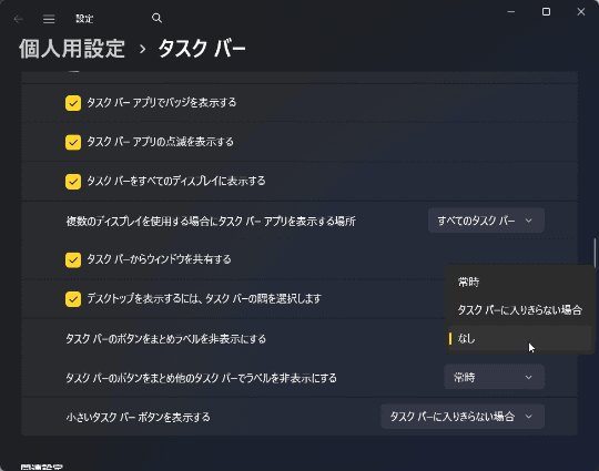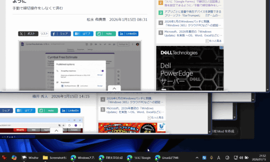Windows 11は、デフォルトで複数のウィンドウがあるアプリがあるとグループ化し、1つのタスクバーボタンに格納される仕様となっている。ただし、「設定」アプリの[個人用設定]-[タスク バー]-[タスク バーの動作]にある[タスク バーのボタンをまとめラベルを非表示にする]を[なし]に切り替えれば、ウィンドウごとにタスクボタンを表示することが可能だ。