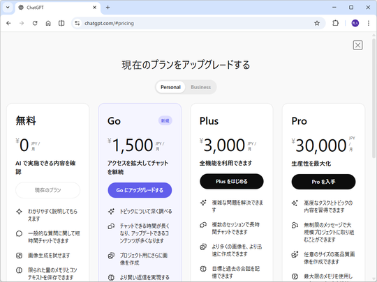 米OpenAIは1月16日(現地時間)、新しいプラン「ChatGPT Go」が世界中で利用可能になったと発表した。「ChatGPT Go」は、2025年にインドで開始された「ChatGPT」の低価格プラン。これまで最安だった「ChatGPT Plus」の半額で、無償プランとのギャップを埋める。