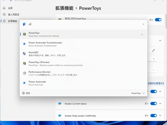「コマンド パレット」(Command Palette) は、キーボード操作だけでOS機能へのアクセス、コマンドやアプリの起動、ファイルやWebの検索、電卓をはじめとするツールの利用などが行えるクイックランチャー。拡張機能の仕組みを備えており、機能のON/OFFや拡張も可能な柔軟な設計になっているのも魅力。古くからあるランチャー機能「PowerToys Run」の後継として現在、開発チームがもっとも注力しているユーティリティといえるだろう。
