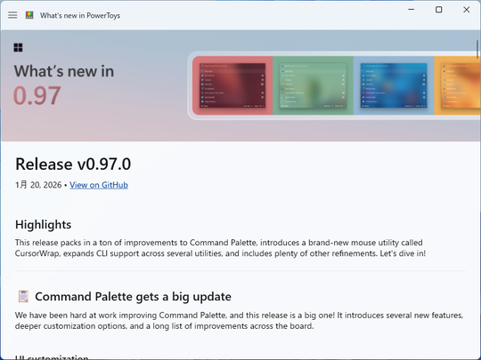 米Microsoftは1月20日(現地時間)、「Microsoft PowerToys」の最新版v0.97.0を公開した。「PowerToys 0.97」では「コマンド パレット」で大規模なアップデートが実施されたほか、「マウス ユーティリティ」に新しいツール「CursorWrap」が追加されている。