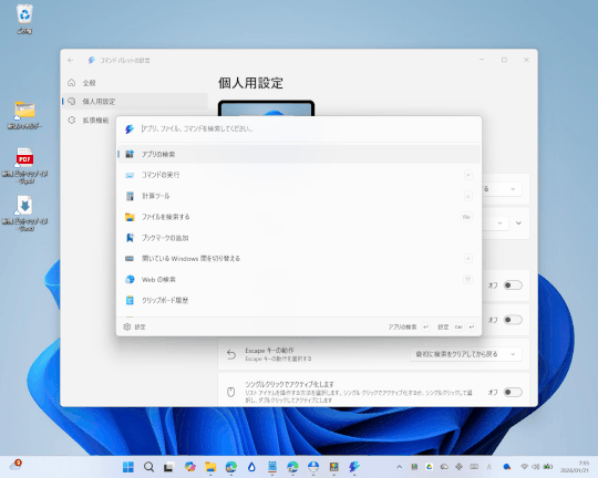 「PowerToys 0.97」ではデザインをカスタマイズする機能が追加され、背景の色や画像を指定できるようになった。設定画面に[個人用設定]ページが追加されており、ここで「コマンド パレット」を自分好みに調整できる。