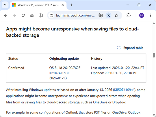 2026年1月のセキュリティパッチを適用したWindows環境で、「OneDrive」や「Dropbox」といったクラウドストレージからファイルを開いたり保存すると、一部のアプリが応答しなくなったり、予期しないエラーが発生する可能性があるとのこと。米Microsoftが1月20日(現地時間)、自社のドキュメントサイトで明らかにした。