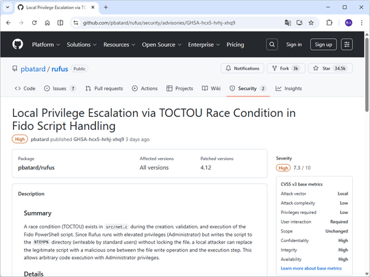ブータブルUSBドライブを簡単に作成できるツール「Rufus」で1月23日(日本時間)、ローカル権限昇格の脆弱性「CVE-2026-23988」が報告された。深刻度の評価は、CVSSの基本値で「7.3」(High)。すべてのバージョンに影響する。