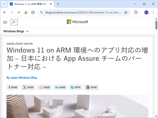 日本マイクロソフト(株)は1月26日、公式ブログ「Windows Blog for Japan」で『Windows 11 on ARM 環境へのアプリ対応の増加』とする題する記事を公開した。2025年後半における日本の「App Assure」チームの成果をアピールしている。