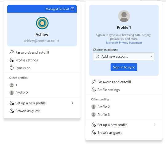 新しいプロファイルフライアウトは仕事用と個人用プロファイルの区別がより明確になり、認証情報(パスワードなど)やプロファイルの設定、同期のON/OFFなどのメニューが新設される。