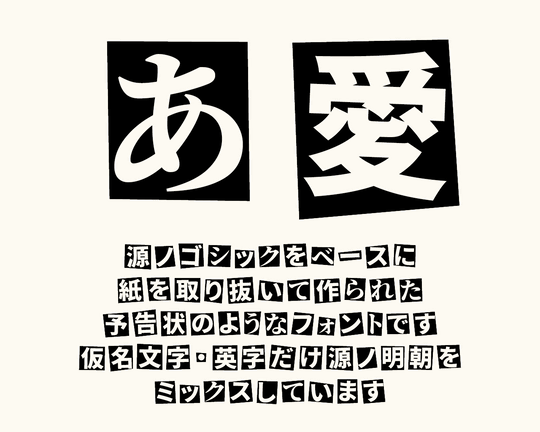 「怪盗予告ゴシック」は、Adobeの「源ノ角ゴシック」(Source Han Sans)をベースに制作されたフォント。それぞれの文字には黒い四角形が配置されているが、その大きさやレイアウトはまちまち。並べると凸凹で、何とも言えないチグハグ感がでてしまうが、それがあたかも新聞紙から一文字ずつ切り抜いて貼り付けたかのような印象を与える。まるで筆跡を隠したい犯人が出した犯行予告状のようだ。