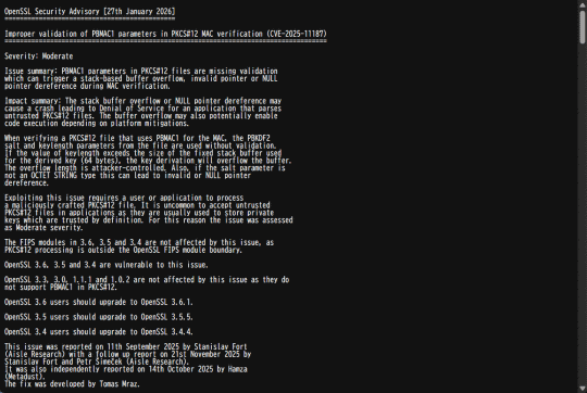 - CVE-2025-69419:PKCS12_get_friendlyname()におけるUTF-8変換の範囲外書き込みによりDoSなどが発生する。v3.6 / v3.5 / v3.4 / v3.3 / v3.0 / v1.1系統のみに影響(Low)