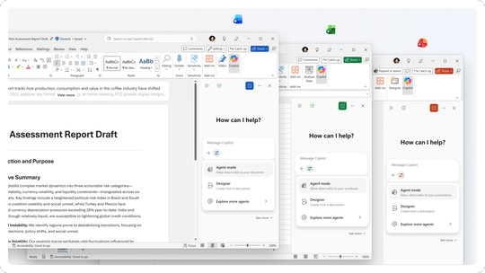 「Microsoft 365 Copilot」ライセンスをもつユーザー向けには、「Excel」のエージェントモードが昨年12月にWebで展開済み。さらに今年1月よりデスクトップでも展開される。同じく「Word」のエージェントモードは11月に展開済み。「PowerPoint」のエージェントモードは2月にWebで提供される。
