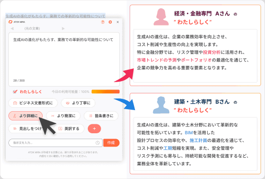 ユーザーの入力傾向に合わせて文章を生成するAI「ATOK MiRA」も搭載