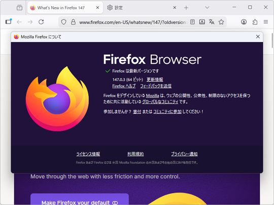 Mozillaは2月4日(米国時間)、デスクトップ向け「Firefox」の最新版v147.0.3をリリースチャネルで公開した。CSSアンカーの位置指定およびナビゲーションに関連するAPIの相互運用性が改善されたほか、以下の問題に対処したマイナーアップデートとなっている。