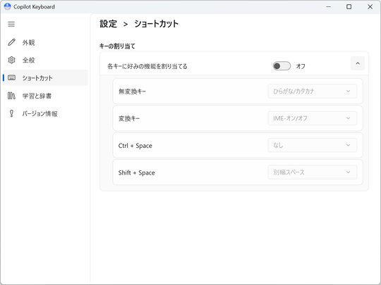 - [Ctrl]+[,]キー:「Copilot Keyboard」の設定画面を表示