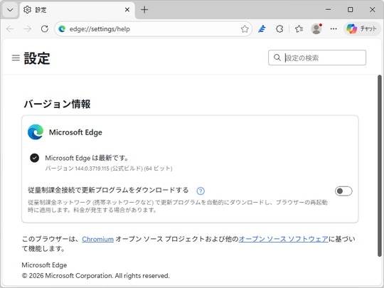 米Microsoftは2月5日(現地時間)、デスクトップ向け「Microsoft Edge」v144.0.3719.115を安定(Stable)チャネルでリリースした。ベースとなっている「Chromium」がv144.0.7559.133、スクリプトエンジン「V8」がv14.4.24.9へと更新されており、以下の脆弱性が解消されているようだ。