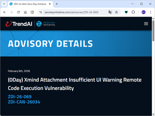 無償で始められる人気のマインドマップツール「XMind」に、悪用が可能な未対策のゼロデイ脆弱性「CVE-2026-0777」が存在することが明らかになった。Trend Microのセキュリティチーム「Zero Day Initiative」(ZDI)が米国時間2月6日、アドバイザリを公開した。