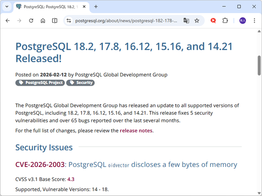 オープンソースのリレーショナルデータベース(RDB)システム「PostgreSQL」で2月12日、セキュリティアップデートが実施された。以下のバージョンへのアップデートが推奨されている。