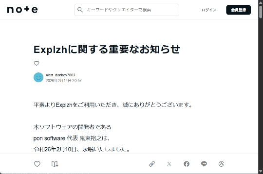 今後も「Explzh」を利用することはできるが、当面の間は新規開発及びサポート対応が休止されるとのこと。鬼束氏に関する家族への問い合わせは控えてほしいとしている。