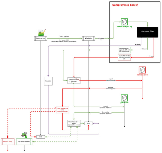 このセキュリティインシデントは、「Notepad++」アプリで用いられている自動アップデートツール「WinGUp」でトラフィック(通信)がハイジャックされ、偽の実行ファイルがダウンロードされてしまったというもの。きっかけは国家に支援されたハッカーによって「Notepad++」プロジェクトのある共有ホスティングサーバーが攻撃を受けたことで、「Notepad++」や「WinGUp」が直接乗っ取られたわけではなかった。