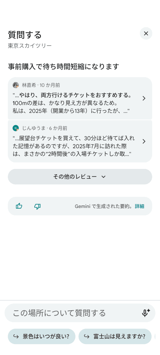 「Google マップ」でレストランやホテルなどの施設を調べると、Geminiがクチコミなどの情報を分析し、予約方法や隠れメニュー、ドレスコード、付近の駐車場の有無などを教えてくれる。
