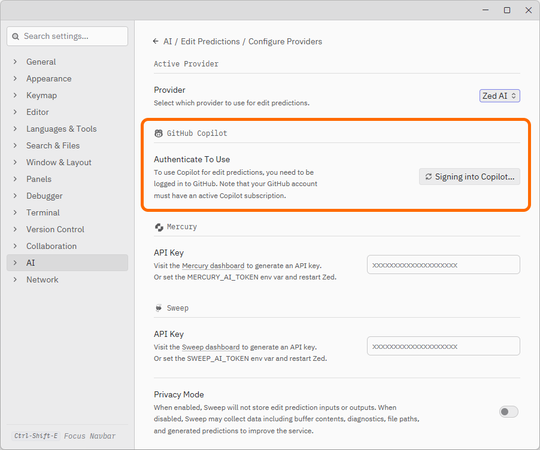 「Zed」はAI機能を内蔵しており、独自の大規模言語モデル「Zed AI」や各社のコーディングAIサービス、「Ollama」「LM Sdtudio」で管理するローカルAIモデルを“プロバイダー”(Providers)として指定できる。「GitHub Copilot」も標準でサポートされており、設定ダイアログの[AI]-[General]ページでプロバイダーを設定(Configure Providers)するだけで、コードの入力補完などで「GitHub Copilot」を活用できるようになる。