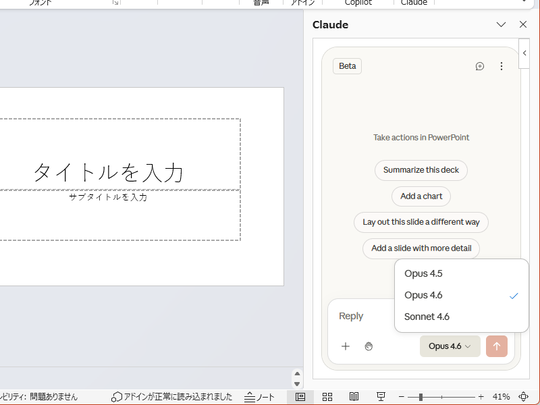 利用できるモデルは「Sonnet 4.6」、「Opus 4.5」、「Opus 4.6」(「Pro」プランで確認)。テキストプロンプトの通りに新たなプレゼンテーションを生成できるのはもちろん、既存のスライドに対し「簡潔にして」などと指示して編集することもできる。