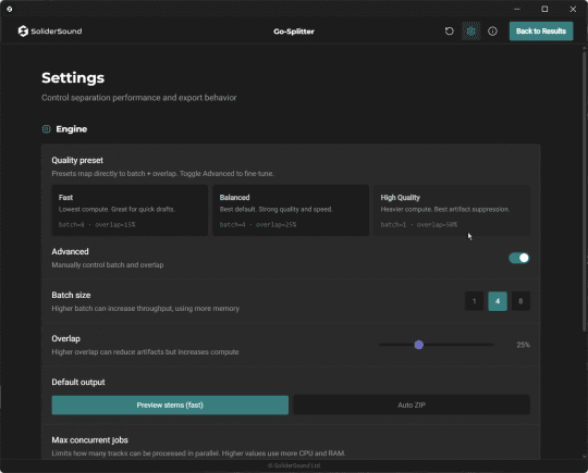 DAW向けを謳うだけあって分離の品質は高く、多少の『シュワシュワ』感はあるものの、少しエフェクトをかければわからない程度に仕上がる。また、設定でクオリティを3段階から選べるほか、分離の精度も調整可能。