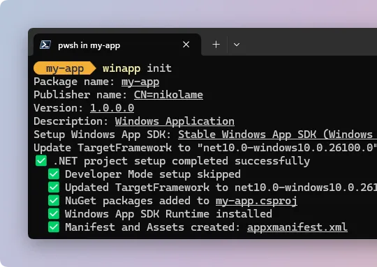 v0.2では、もっとも要望の多かった.NETプロジェクトをネイティブサポート。.NETプロジェクトファイル(*.csproj)のあるフォルダーで「winapp init」を実行すれば、開発プロジェクトで.NETが用いられていることを検知し、適切な初期化を行ってくれる。
