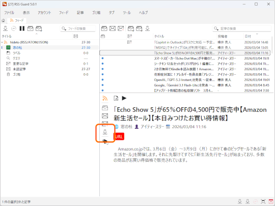機能面での目玉は、 記事の全文取得 機能だ。記事の冒頭部分しか配信されていないフィードがあっても、その続きをワンボタンで取得し、「RSS Guard」上で読むことができる。あくまでも簡易的なもので、コンテンツの一部が欠けたり、体裁が省略されたりすることもあるため、記事全体を読みたい場合はシステム既定のWebブラウザーを用いるのがお勧めだが、流し読みしたいだけなら十分に使える。