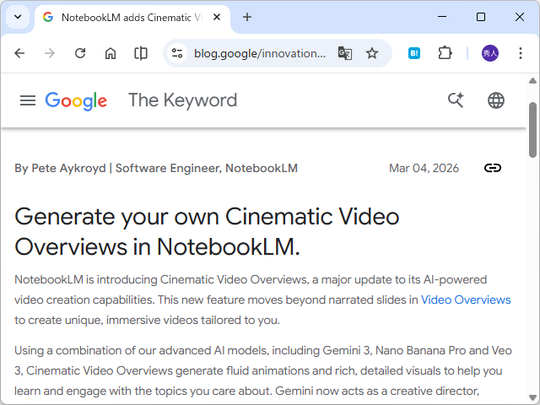 米Googleは3月4日(現地時間)、AIノートブック「NotebookLM」で“シネマティック動画概要”(Cinematic Video Overviews)を生成できるようになったと発表した。