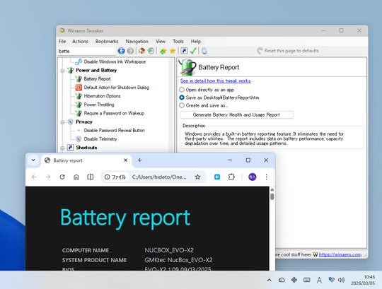 Windows 10/11では「powercfg /batteryreport」コマンドでバッテリーレポートを出力可能。「Winaero Tweaker」ではこれをGUIから行えるようになった。また、レポートの保存先を指定できるようにするなどの改善も加えられている。出力したバッテリーレポートは、Webブラウザーで自動で開かれる。