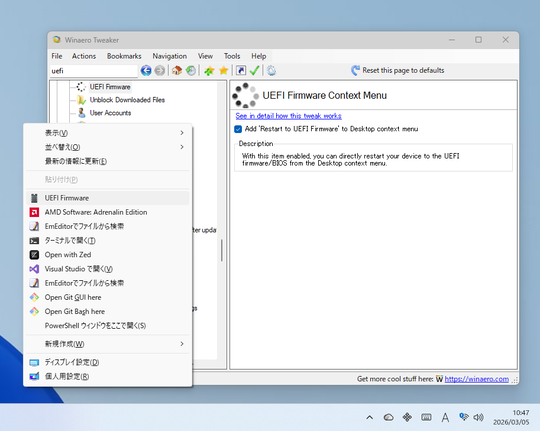 デスクトップの右クリックメニュー(Windows 11の場合、[Shift]キーを押しながら右クリックするとアクセスできるクラシックメニュー)に[Restart to UEFI Firmware]コマンドを追加するオプション。OSを再起動して、UEFIファームウェアへアクセスできるようにする。