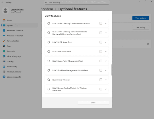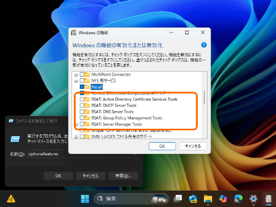 「バージョン 25H2/24H2」の場合、2026年2月のWindows非セキュリティプレビュー更新プログラム「KB5077241」以降でOSのオプション機能として提供される。[Windows の機能]ダイアログ(optionalfeatures)などから各種「RSAT」コンポーネントを有効化可能。