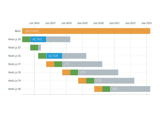 つまり、各バージョンは以下のスケジュールで運用される。新しいリリースサイクルに従う「Node.js 27」のリリース時期も付記する。