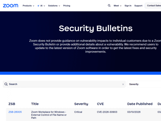 今回アナウンスされた脆弱性は以下の通り(カッコ内は深刻度の評価と「CVSS」の基本値)。v6.6.0より前の「Zoom Workplace」のメール機能におけるファイル名またはパスの外部制御により、非認証ユーザーが権限昇格を実行できてしまう問題「CVE-2026-30903」などが含まれる。